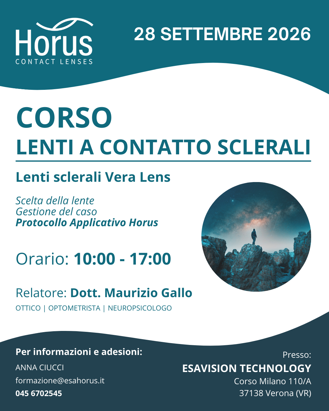 VERA, l’innovativa linea di lenti sclerali prodotte da Horus, progettata per semplificare ogni fase dell’applicazione. Il corso offre un approccio pratico e guidato, pensato per professionisti che vogliono imparare a selezionare e gestire le lenti sclerali con sicurezza e precisione. Attraverso un protocollo strutturato, i partecipanti acquisiranno competenze concrete per: Individuare rapidamente la lente più adatta ad ogni paziente, Applicare e rimuovere le lenti in modo semplice e controllato, Gestire l’intero processo con un metodo chiaro e facilmente replicabile. Il percorso formativo è ideale per chi desidera integrare le lenti sclerali nella propria pratica senza complessità, riducendo tempi e margini di errore. Relatore: Dott. Maurizio Gallo, Ottico Optometrista e Neuro Psicologo